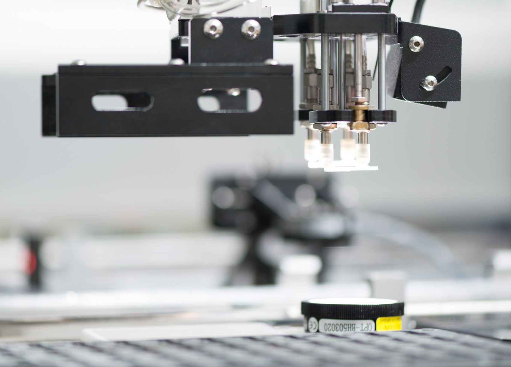 设备高度集成,在紧凑的设备和产品空间里,贴合微小尺寸的标签,标签最小尺寸1mm*1mm。主要有标签自动送料、自动剥离、自动吸附、自动贴合等功能。
